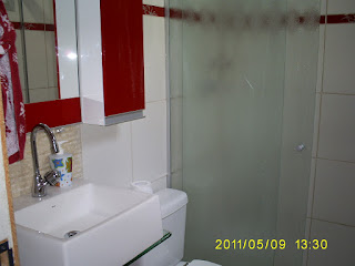 Piso Porcelanato 50 x 50, revestimento parede Portobello branco, 30 x 60, branco. Listelo, Incepa, 5 x 45, Akron beje. Cuba de apoio, Deca.